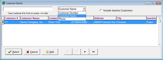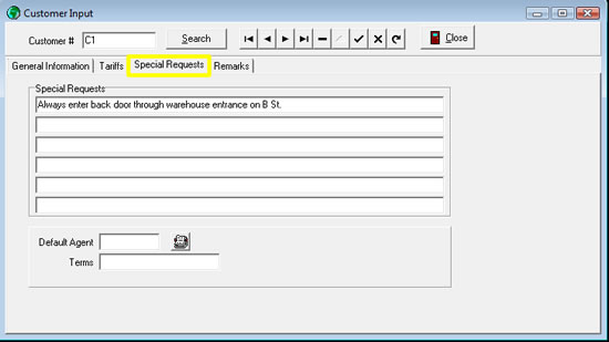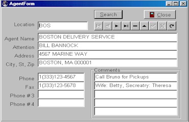 Agents Agents can be either Delivery agents or Drivers. Input is very similar to customer input. You select the agent you want to edit on the Agent Search Dialog screen and click OK. Add a New Agent Since m ost users select an airport code for the Agent account number, enter that code and click Add. The Airport Code is not a requirement, but you are limited to a five-character location number. Complete the agent information on the input screen. Click Close when finished. |
